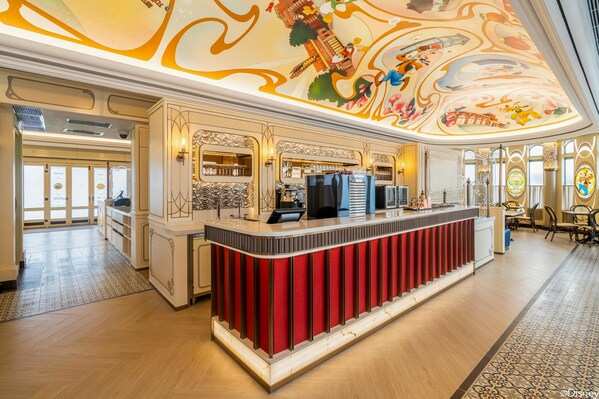 步入这家全新的餐厅,游客随处都能感受到室内设计的创意巧思,每一处独具匠心的细致装潢都描绘了唐老鸭和朋友们关于友谊和团聚的故事片段。不论是天花板上绘制的壁画还是墙上的复古玻璃彩绘,餐厅里各处都点缀着唐老鸭、米奇、米妮、高飞、布鲁托、黛丝、奇奇和蒂蒂、唐老鸭的侄子辉儿、路儿和杜儿的身影,随手一拍即是美照。餐厅拥有开放式厨房,还配备了让人印象深刻的披萨炉和吧台,游客能够亲眼见证大厨们施展迪士尼的美食魔法,制作热气腾腾的披萨和爽口特饮。