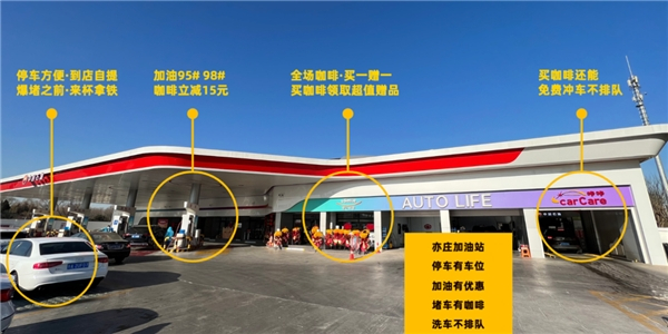 记者发现,试营业首日,好客·智咖啡的现磨饮品就已经在加油、汽车服务、便利店商品等方面与昆仑好客进行了深度整合,亦庄加油站试运营就已经开启了“咖啡买一赠一”、“加油95# 98#,咖啡立减15元”、“买咖啡拿赠品”和“喝咖啡送洗车”等优惠活动。现磨咖啡的高频次消费似乎已经成为了拉动油品、商品与服务的消费人流新动力。