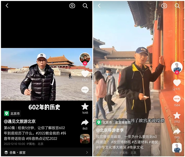 @遇见文旅游北京 账号主播张祖健自2007年开始从事导游工作。疫情以来线下旅游受到冲击,张祖健于去年5月开始在抖音为网友讲解故宫等北京世界文化遗产景点的相关知识,至今已吸引了超200万粉丝关注。网友在欣赏故宫美景、了解中国传统文化的同时,还会给张祖健点赞打赏,为他带来新收入。在张祖健看来,粉丝的每一次打赏,都是对他内容的认可,“每一个认可,都来之不易。”