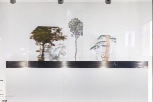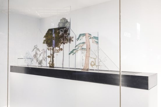机械装置采撷世界艺术史中不同绘画大师的的树木图像,如宋画、文艺复兴艺术、波斯细密画,日本浮世绘等等,置于透明镜片上,镜后前后平行安装,部分可以缓速运动,最终形成前后景观的错位叠现。代表着异度时空的文明形象,隔空相望,平视互问,共生的全球化的象征愿景。