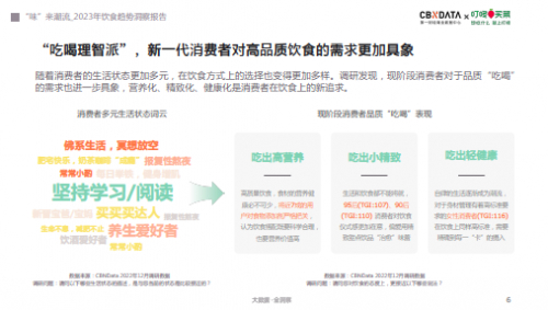 如何才算吃得好呢?踏进品质新“食”代的消费者自有一套饮食升级新标准。由CBNData消费调研数据归纳总结得出,有以下三方面较为明显的饮食新升级消费趋势洞察:
