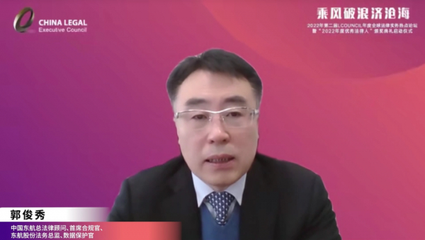 首先由中国东航总法律顾问、首席合规官、东航股份法务总监、数据保护官郭俊秀先生带来以“企业如何搭建“法律、合规、风险、内控”四位一体的管理体系”为题的分享。凭借对行业多年观察与极为丰富的企业法律管理经验,郭总为同行们梳理了企业在四个层面实现管理体系搭建的制定措施与落地后要点。