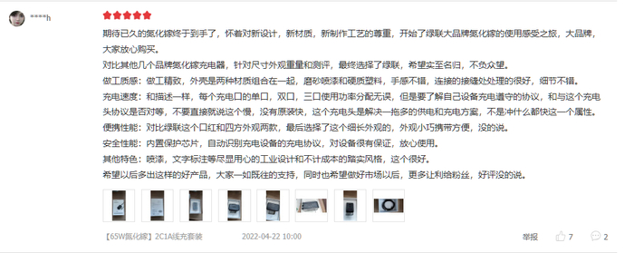 从电商平台的好评率上可以看出,目前绿联的产品综合好评率非常高,用户主要的称赞点在于产品的外观手感、做工质量、功能实用性等等。比如某位用户在用过绿联65W氮化镓充电器后,做出了大篇幅的好评,涉及做工、手感、设计等诸多方面。还有用户对充电速度、便携性、安全实用性等方面表达了高度评价。