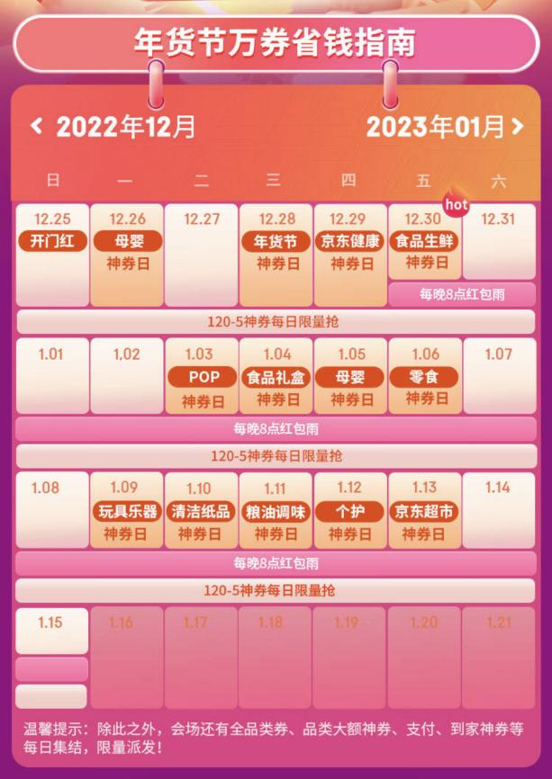 大牌神券日每天还将上线不同场景券,带你媷遍全品类优惠。 1月5日,母婴大牌神券日,1月6日,零食大牌神券日,1月9日,玩具乐器大牌神券日,1月10日,清洁纸品大牌神券日,1月11日,粮油调味大牌神券日,1月12日,个护大牌神券日,1月13日,京东超市大牌神券日,快收好这份追抢日历。