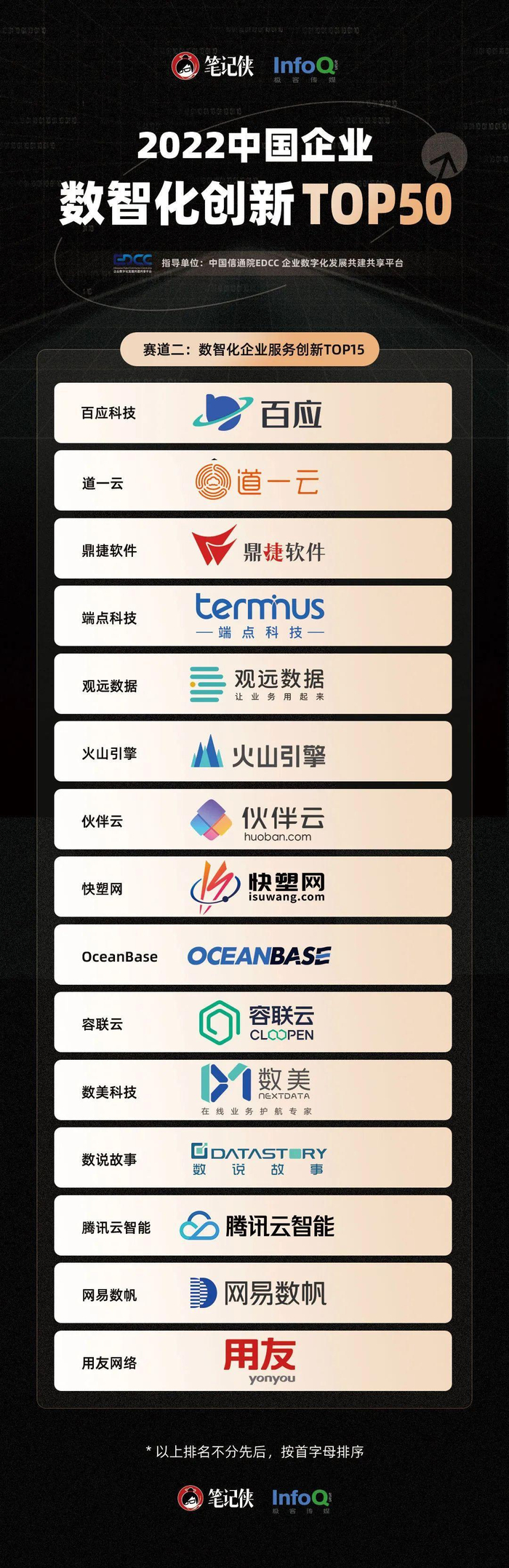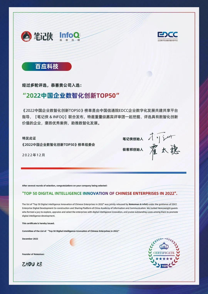 为褒扬和传播数智化创新的优秀案例,发现能代表未来的数智化创新企业,在中国信通院EDCC企业数字化发展共建共享平台的指导下,笔记侠和InfoQ联合发起了“2022中国企业数智化创新TOP50”榜单评选。该榜单历时三个月完成招募、初评和复评,经过严谨的评分体系考核,最终从众多优秀的数智化企业中评选而来。