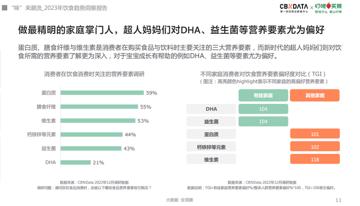 相对于其他家庭,宝爸宝妈们对于饮食营养和品质提出了更高的诉求,食品锁鲜工艺、是否有机以及食品源产地同样是有娃家庭在食材选购时的重要关注点。新时代的超人妈妈们则对饮食所需的营养要素了解更为深入,对于宝宝成长有帮助的例如DHA、益生菌等要素尤为偏好。