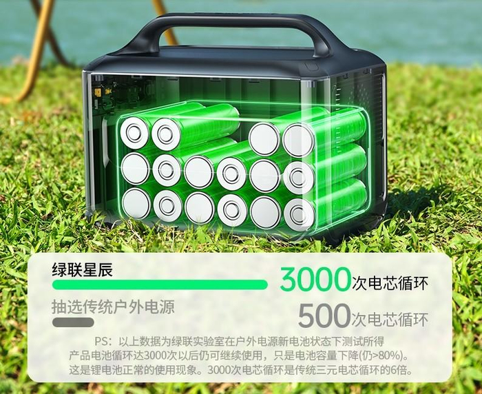 在核心装置上,绿联采用汽车级别动力电池——磷酸铁锂电芯,磷酸铁锂作为目前行业安全级别最高的电池类型之一,具有耐高温、倍率放电、循环寿命长等特性,即使遇到挤压、针刺、过充、过温等特殊状况,也能保持稳定运行。而且这类电芯拥有3000次循环寿命,相比普通锂离子电芯,耐用性提升高达6倍。