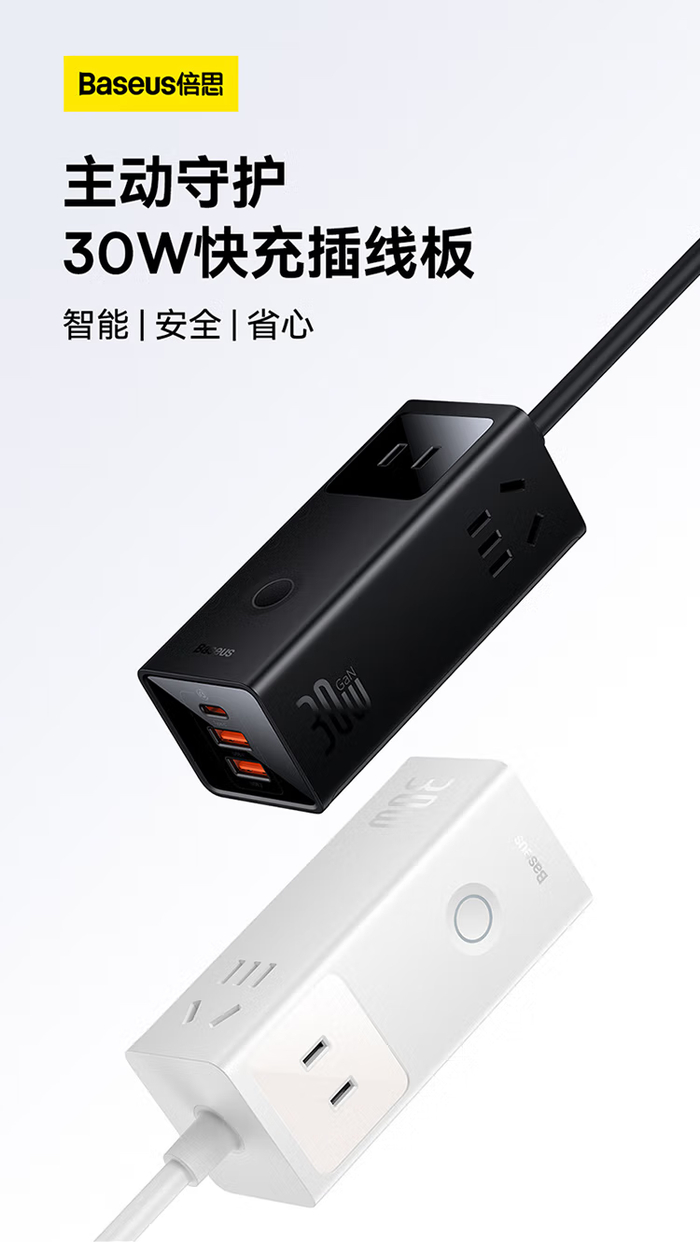 倍思灵傲系列数字式快充插线板30W通过集成氮化镓快充模块改变了传统插线板的形态以及功能,带来更出色的充电体验,也让用户减少不必要的充电器,带来更整洁的桌面。倍思快充插线板是倍思技术创新的产品,为用户提供简单易用以、方便携带、功能丰富的产品,也在践行倍思产品实用而美的宗旨。