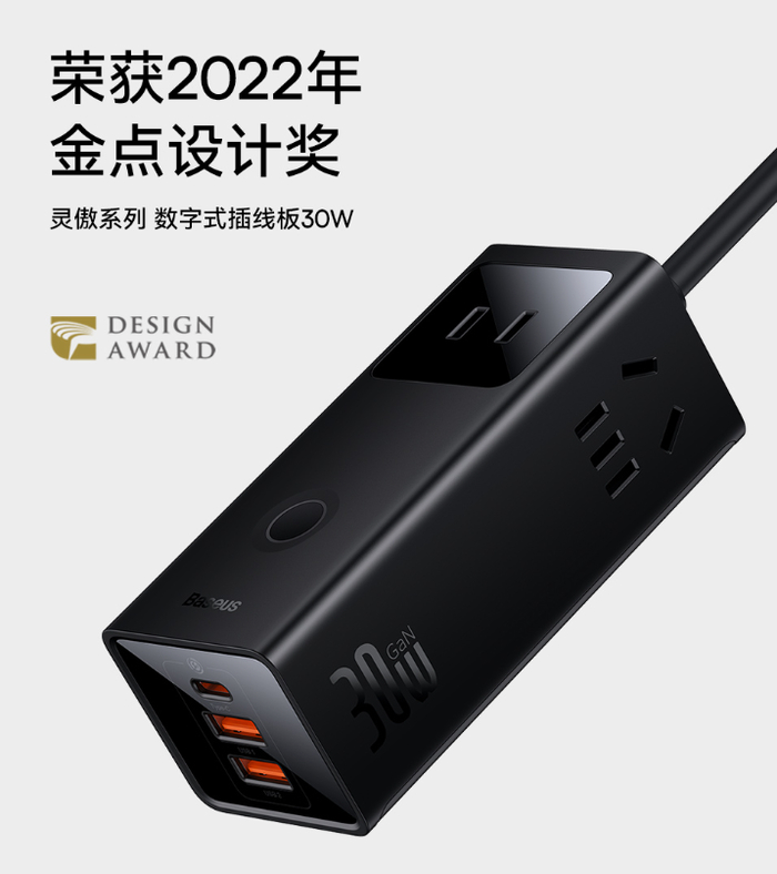 倍思快充插线板作为改变传统插线板的产品,在外观设计上,倍思灵傲系列数字式快充插线板30W采用更小巧的体积,加上应用上第五代氮化镓技术,带来更安全更便捷的充电体验。