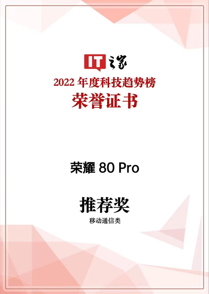 “IT 之家 2022 年度科技趋势榜”自 2022 年 12 月启动以来,以客观视角汇集万千读者口碑和消费选择,经层层筛选,评选出 2022 年度好产品。荣耀80 Pro再度突出重围,被《IT之家》授予2022年度“移动通信类推荐奖”。