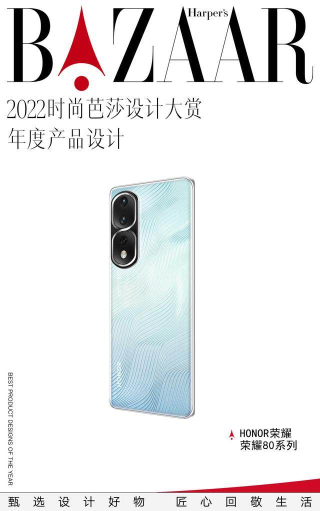 在2022年的手机市场中,有太多的优秀产品让人过目难忘。作为手机领域中的权威垂直媒体,《手机中国》最终将“年度美学设计奖”授予荣耀80系列,认为荣耀80系列堪称是2022年手机美学设计的一大风向标。《手机中国》的评委们表示,荣耀80系列的美学设计在于恰到好处,成功将时尚、潮流注入产品本身,造就了荣耀数字系列的又一美学之作。全新的碧波微蓝配色,采用了3D复合精刻工艺,由表面静止的线条与底层具有流动感的纹理膜片叠加组合,呈现出了随光线的流转变化,完美诠释出了与光同行的概念。
