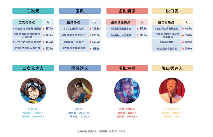 这间接导致了一个潮流——平台消费知识类内容的繁荣。2022年前三季度,抖音消费类知识内容的播放量同比增幅为56.8%,同期评论量和转发量增幅超过了92.1%和76.7%。其中吃穿用,三个赛道中,食品饮料行业,关于健康原料的讨论已经爆发(你懂的);服饰鞋包行业,工艺是个风口;美妆个护,成分功效热度不减。这些是实实在的消费者喜好代表。