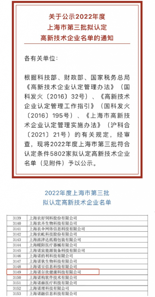 2022年12月14日,上海市第三批国家高新技术企业名单已公示,上海诺尔欣健康科技有限公司(以下简称“上海诺尔欣”)便在名单中。