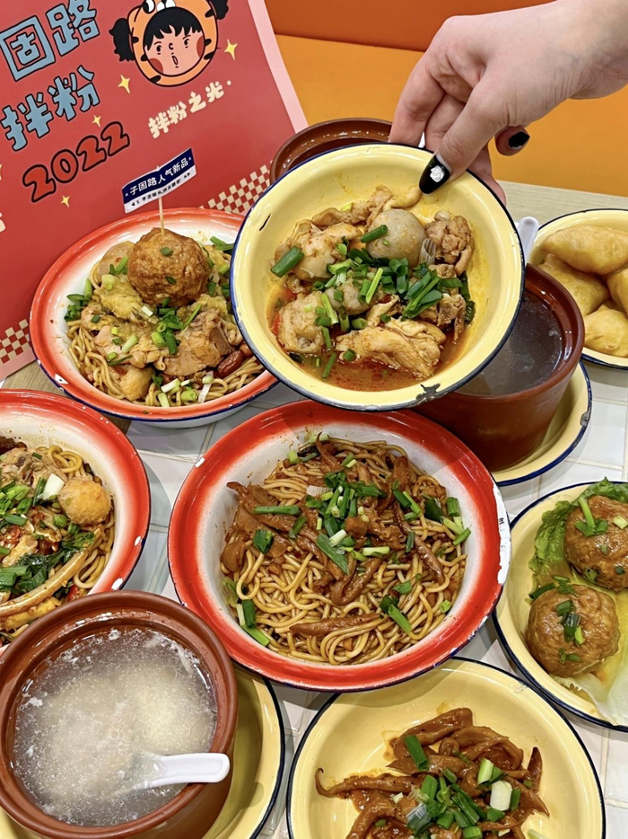 像南昌拌粉的全国头部品牌子固路拌粉,整体走怀旧风格,环境是80年代的复古风,餐具是古早的搪瓷盆。店里主打产品是辣味十足的拌粉,牛肉、猪耳朵、牛筋&鸭掌筋、土豆泥、芋儿鸡等十几种浇头,口味鲜辣,又自带网红属性,再搭配解辣的瓦罐汤,一汤一粉十分自在。