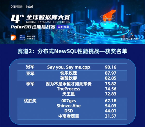 日前,由阿里云联合英特尔主办的“第四届全球数据库大赛—PolarDB性能挑战赛”圆满收官。历经近6个月的激烈角逐和层层评选,2大赛道20支队伍成功进入决赛圈,最终来自电子科技大学的「陕西宝鸡」和中国工商银行的「Say you, Say me.cpp」2支队伍分别摘得赛道1(云原生共享内存数据库性能优化)和赛道2(分布式NewSQL性能挑战)的总冠军桂冠。