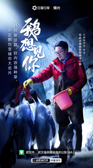 “企鹅爸爸”罗成,是海昌海洋公园的保育员,为了改变园区游客骤减、经营停滞所带来的打击,罗成与园区员工纷纷开始尝试短视频直播,打开新话题,分享极地动物的生活,让每个人能见所想见。 他还带领饲养的明星小企鹅“大七”和“小七”打卡武汉地标景点,在抖音上以“游园直播”和话题挑战赛的方式进行内容种草,带动景区旅游,并参与抖音上发起话题#鹅想见你,播放量超过10亿次,同时在直播间精准投放,促进预售票和团购券的售卖,为开园当天带动了3000人入园的火爆生意。