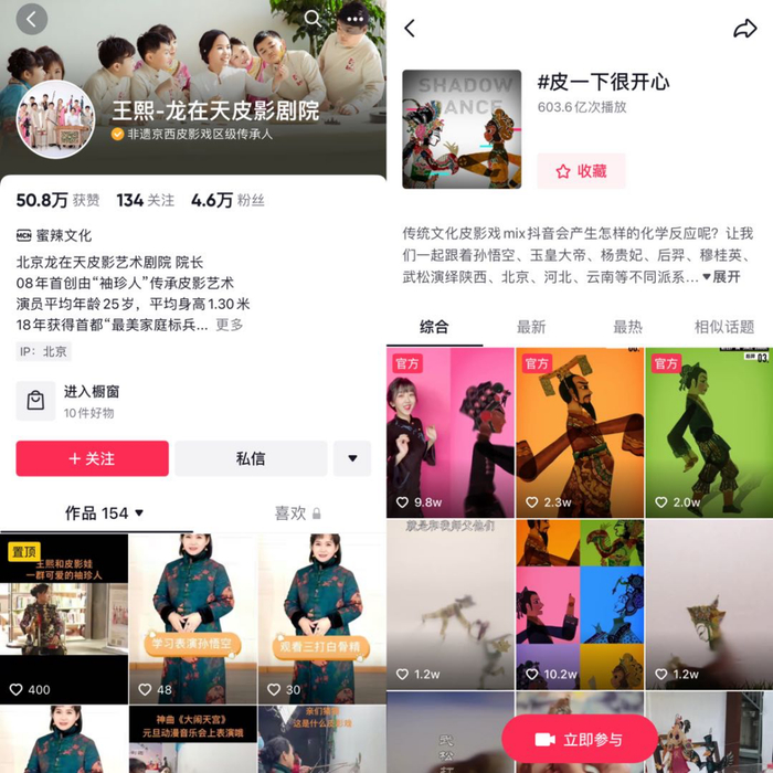 王熙-龙在天皮影剧院 为了更好地传播中国传统非遗皮影戏,京西皮影戏不断创新,编写了皮影戏教材,研发皮影戏教具,秉持着“让皮影艺术生活在我们身边”的宗旨,还推出了一系列皮影戏文创产品。同时不断尝试新的传播方式,开通@王熙-龙在天皮影剧院的抖音账号,创新系列皮影戏内容,联动剧场袖珍演员表演,与年轻人互动,吸引了很多粉丝前来打call。京西皮影戏借助巨量引擎,开启#皮一下很开心 的话题活动,邀请达人参与打卡,相关视频收获603亿+的播放量。同时,2021年,京西皮影戏还与抖音文创合作,推出了一款皮影礼盒,上线了一款皮影AR特效。京西皮影戏非遗传承人王熙表示,未来将继续与抖音文创、巨量引擎携手,以创新内容传承皮影戏文化。