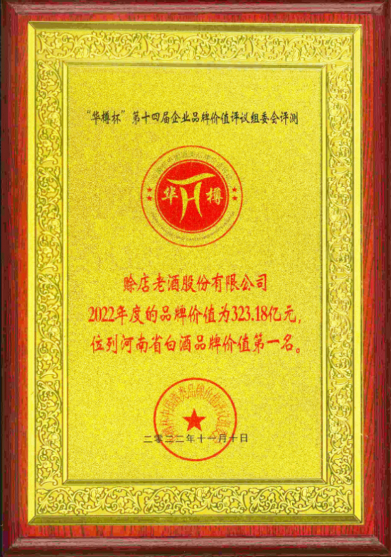 在2022年中国酒类流通协会主办的“华樽杯”中,赊店老酒以323.18亿元的品牌价值位列中国酒类品牌价值榜单第38名,连续两年拔得豫酒品牌价值头筹,并斩获多项殊荣:赊店老酒荣获2022年度“华樽杯”河南省白酒最具发展前景品牌以及2022年度“华樽杯”中国白酒最具增长潜力品牌,元青花•洞藏年份酒荣获2022年度“华樽杯”豫酒品质领导品牌以及2022年度“华樽杯”豫酒品质典范奖。