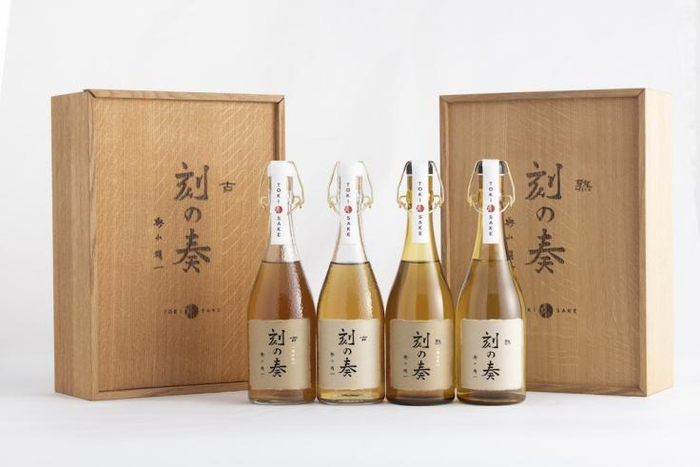为了让日本酒成为被世界认可的美酒,2022年由7家藏元联合成立的“刻SAKE协会”推出,日本威士忌界第一人“舆水精一”亲手打造的「刻の奏」限定礼盒套装横空出世。礼盒内含4瓶熟成时间超过十年的品质清酒,全球限量120套。