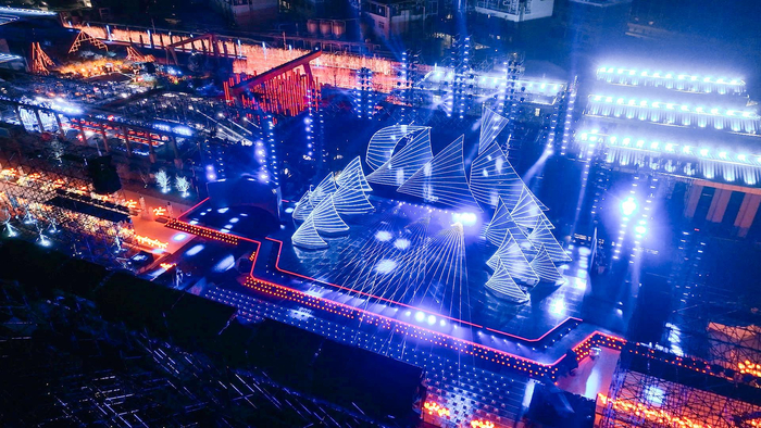 为了传达出“扬帆起航”的寓意,本次晚会将录制地点选在了台州梦创园,与大多数中规中矩的晚会场地不同,梦创园整体外形酷似游轮,再搭配由不同造型的帆组合而成的晚会主舞台,更让人想到“乘风破浪潮头立,扬帆起航正当时”的诗句。除此之外,原本就熠熠生辉的舞台上,还装饰着黄岩当地制造的“小橘灯”,金色的光影与帆船造型遥相呼应,可谓是美轮美奂。