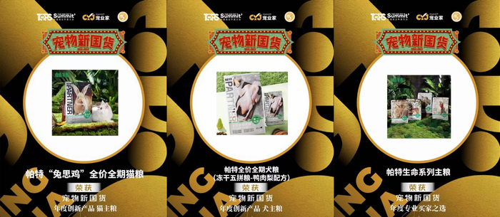据悉,由中国宠业年度大会、宠业家、山东省宠物行业协会联合主办的2022年度“宠物新国货”颁奖礼于2022年12月29日圆满落幕。受疫情影响,本次颁奖礼以线上直播的形式举办,在1.5万人的见证下帕特以“‘兔思鸡’全价全期猫粮”、“鸭肉梨配方冻干五拼犬粮”两项产品,获得“2022年度创新产品”奖项;以“生命系列主粮”产品,荣获“宠物新国货2022年度专业买家之选”奖项。