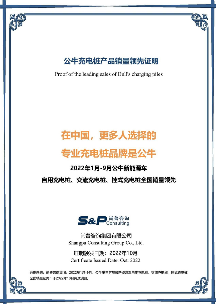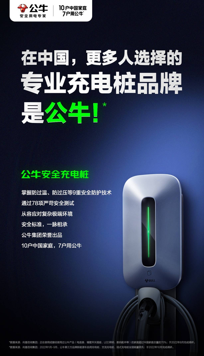根据权威机构尚普咨询研究数据显示,公牛充电桩产品今年前三季度(1-9月)全国销量表现优异,在新能源车自用充电桩、新能源车交流充电桩和新能源车挂式充电桩三大细分市场独占鳌头。这既是对“专业专注、只做第一、走远路”发展理念的践行,也展现了消费者对公牛充电桩品质的认可。凭借这些销量领先,公牛继在开关插座行业领跑之后,也成为更多国人选择的专业充电桩品牌。