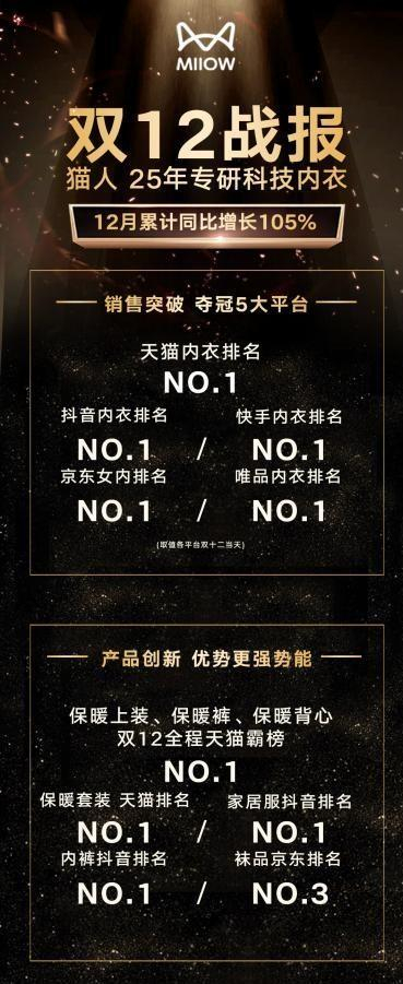 提到猫人,就不能不提热八度科技内衣。作为近两年大火的国民内衣产品,猫人热八度亲肤、柔软,保温和升温能力受到了消费者一致好评。除了明星代言,国民热捧,猫人热八度已经穿到了南北极,曾经作为中国南北极考察队选用的唯一暖衣产品为科研人员提供助力,并收获了高口碑评价。截至目前,猫人科技内衣在全球销量突破10亿件,品牌2021全年GMV达69亿元,连续5年实现70%业绩高增长,2022年更是突破百亿大关。