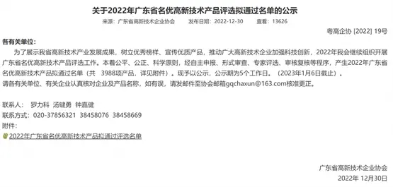“广东省名优高新技术产品”评选是在过去高新技术产品评选基础上的延续和进一步升级,对高技术、高质量、市场前景有更高要求,评选的产品具备达到国内先进水平等特征,认定门槛高、难度大、含金量高,是企业核心竞争力的体现。