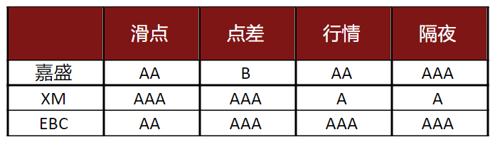 在点差上,嘉盛、XM和EBC分别获得了B、AAA和AAA的评价。
