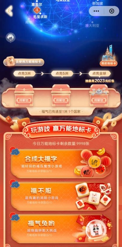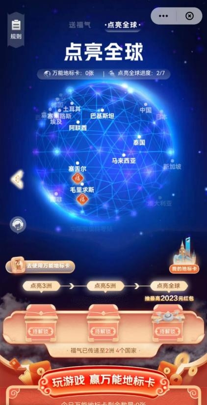 为了增加“点亮全球”环节的趣味性,活动还设置了3款互动小游戏。用户玩游戏可获万能地标卡,点亮任意地标,冲刺2023元红包大奖!