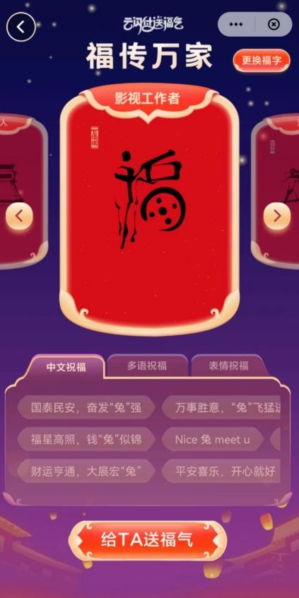 百福中,同样蕴含着人们对兔年生活的美好期许与向往。用户在云闪付APP活动首页点击【去分享】或【做任务】按钮,至【福传万家】页面搜索,选择百福图并添加中文祝福、多语祝福、表情包祝福等个性化祝福,分享给亲朋好友。在形式多样的春节祝福中,感受到轻松温馨的过年气氛,让新年向往+1!