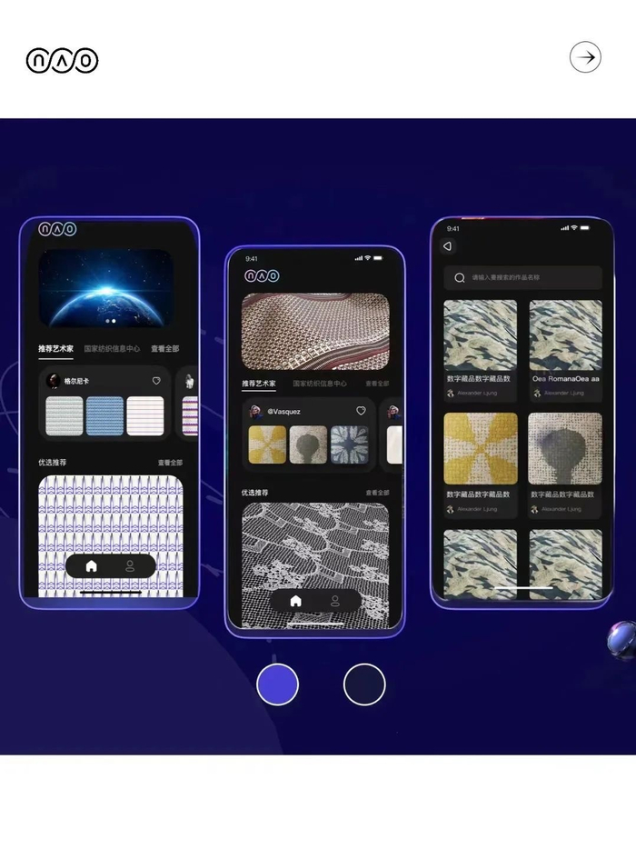 “NAO”数字面料平台中的作品由两个组织生成-青甲智能科技与国家纺织中心。青甲科技邀请多位面料艺术家以及视觉艺术家,运用“NAO”虚拟织布机技术创作面料结构图,并将作品上传至本应用进行展示。国家纺织信息中心则由AI人工智能绘制数字面料图,上传至本应用进行展示。