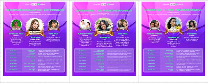 12月16日,由敦煌网集团、APEC Women Connect、MyyShop联合主办的第三届APEC Women Connect “她力量”全球社交电商女性创业大赛举行了颁奖典礼,宣布赛事正式落下帷幕。自9月启动以来,在3个多月的赛事周期内,比赛吸引了来自亚洲、美洲、欧洲、澳新地区的1000多名女性创业者踊跃报名,在Z世代社媒内容创作者和关键意见领袖(KOL)两个赛道上角逐大奖。最终,经过社媒投票,综合专家评审意见,女性创业跨国团队Insightscoop,以及尼日利亚创业者Nusaiba Labaran、英国时尚爱好者Natalie Larose Wright在“终极全球奖”上斩获三甲,另外还有六位来自世界各地的女性或团队分别在“最佳创作奖”、“最佳营销奖”两个奖项上脱颖而出,夺得奖牌。