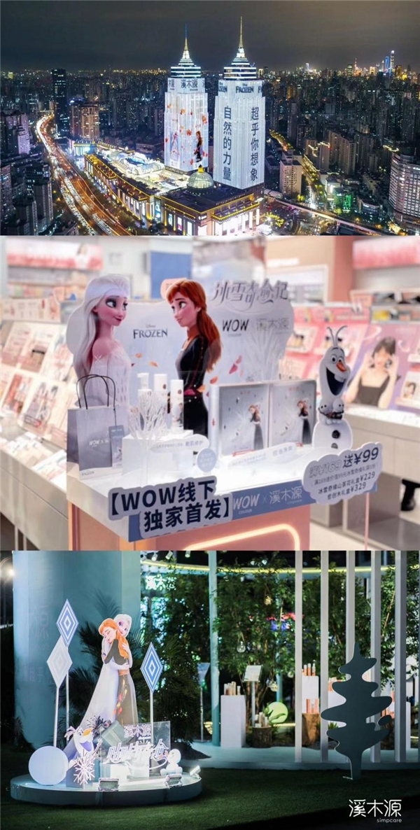 值得一提的是,两次联名除了在产品上下足了巧思以外,还在线下掀起了梦幻互动和打卡热潮。12月12日,溪木源在上海双子塔打造了一场以“贴贴有奇愈”为主题的梦幻灯光秀,实现艾莎与安娜隔空联动。随后,12月16日至1月31日期间,溪木源联合网红彩妆集合店WOW COLOUR,深度绑定迪士尼冰雪奇缘主题消费场景,在广州天河开启 “贴贴有奇愈”的快闪主题活动。此外,溪木源还联合网易哒哒及网易云音乐,打造多维互动体验、趣味H5小游戏带领用户解锁隐藏的多位迪士尼公主人格。而在2022年广州时尚消费节上,也出现了溪木源公主联名和冰雪奇缘系列礼盒的身影。