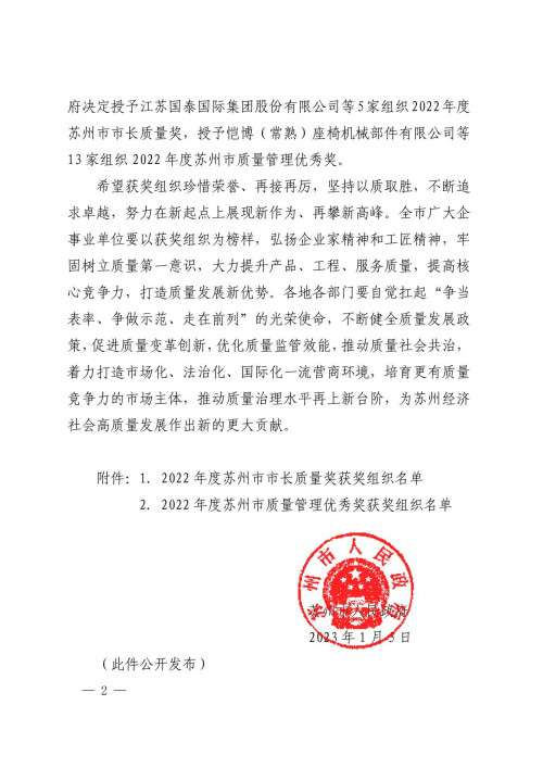 苏州市质量奖由苏州市人民政府设立,授予在全面质量管理和经营绩效上取得显著成就的苏州企业和组织。这些获奖企业为苏州市企业坚持质量第一、效益优先,持续追求卓越绩效,推动经济社会高质量发展方面树立了标杆,同时也为苏州市企业争创更高质量荣誉奠定了扎实基础。