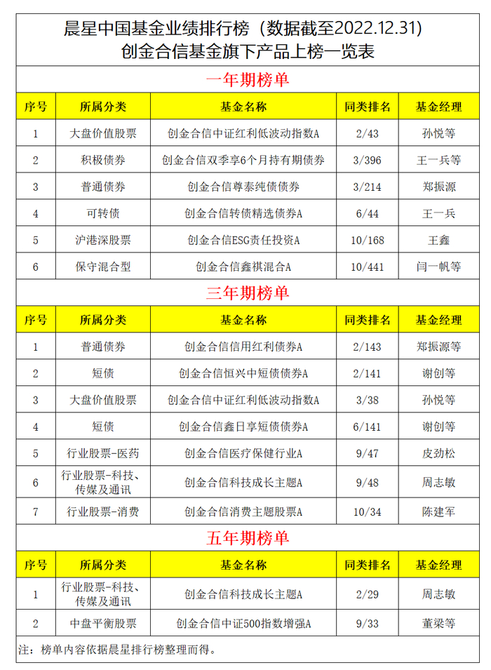 注:基金排名来源于Morningstar,排名数据截至2022年12月31日。创金合信中证红利低波动指数同类为“大盘价值股票”;创金合信ESG责任投资同类为“沪港深股票”;创金合信鑫祺混合同类为“保守混合型”;创金合信转债精选同类为“可转债”;创金合信双季享6个月持有期债券同类为“积极债券”;创金合信尊泰纯债债券同类为“普通债券”;创金合信科技成长主题同类为“行业股票-科技、传媒及通讯”;创金合信医疗保健行业同类为“行业股票-医药”;创金合信消费主题股票同类为“行业股票-消费”;创金合信信用红利债券同类为“普通债券”;创金合信恒兴中短债债券、创金合信鑫日享短债债券同类为“短债”;创金合信中证500指数增强同类为“中盘平衡股票”。