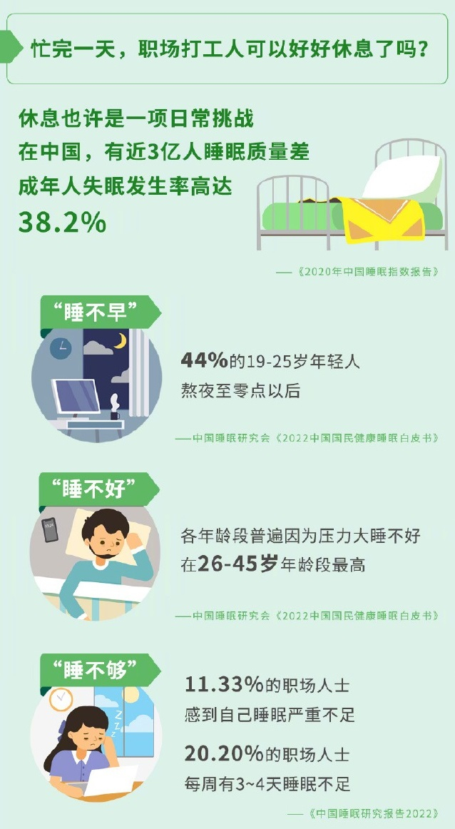 夜间休息也许是一项日常挑战,“搬砖人”的失眠问题亟待重视。在中国,有近3亿人睡眠质量差,38.2%的成年人面临失眠问题。图谱显示,中国人面临着“睡不早”“睡不好”“睡不够”的睡眠问题——44%的19-25岁年轻人熬夜至零点以后,职场压力是引发53%的人失眠的首要因素,11.33%的职场人士感到自己睡眠严重不足,20.2%的职场人士表示每周有3-4天睡眠不足。