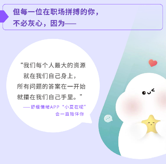 专家强调,在全面复工、复产、复市的社会需求下,每个人都应该识别自身的心理状态和所处的环境,采取有效的措施和手段稳定情绪、加强沟通,坚守自身心理安全底线,快速调整心态,以积极、正面的情绪迎接新生活。除主动学习心理学相关知识,专家还建议个人可借助专业、科学的心理测试工具时时检测心理状态,如中国心理安全月中同期推出的舒缓情绪APP“小夏在呢”,也已经成为大量用户识别自己心理安全状态的有效工具。