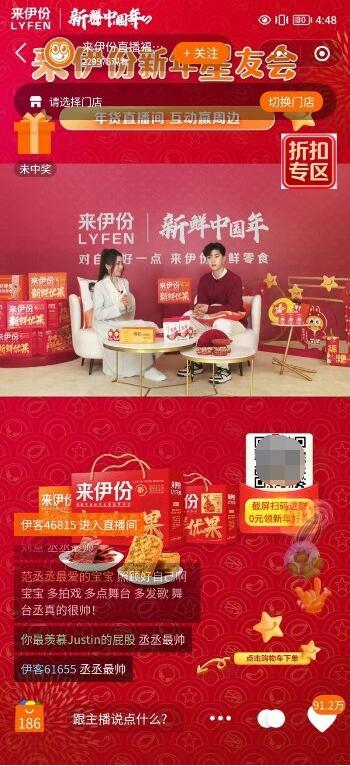 直播当天,范丞丞一袭红装亮相直播间,满满的新年喜庆味道。作为来伊份品牌形象代言人,百变少年范丞丞在直播间和粉丝云玩起了“造梗游戏”,在线送上新年祝福表情包。有梗、有趣的互动方式让范丞丞和来伊份直播间疯狂吸粉,“照顾好自己,宝宝多拍戏多发歌,舞台丞真的很帅!“,”想要、想要,太平洋的水是我为来伊份流的口水”...... 弹幕不停刷屏。