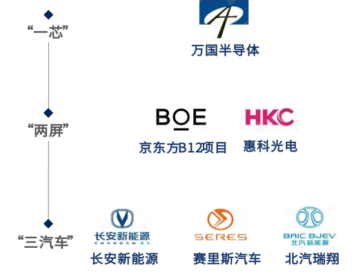 “一芯两屏三车”分别指投资的万国半导体、京东方,惠科金渝、长安新能源、赛力斯汽车、北汽瑞翔。通过引入产业方中行业领军企业在重庆深耕发展,释放出其强大的龙头效应,持续推动产业链上下游企业的集聚。