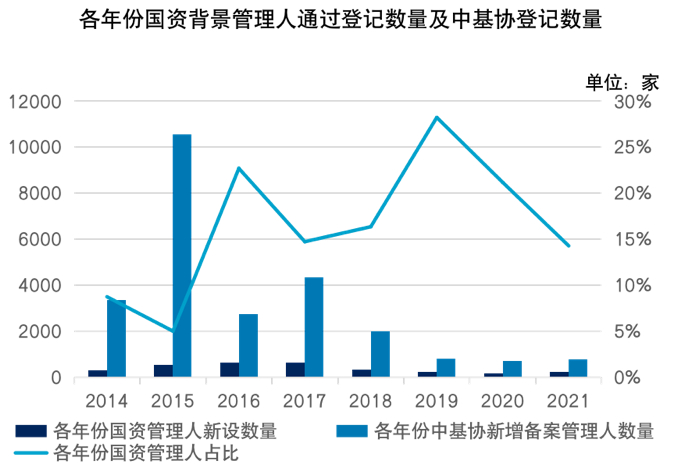 各年份中当年通过中基协登记的国资背景基金管理人数量保持平稳,随私募基金管理人登记政策收紧未受到明显影响,近三年中当年通过登记通过数量约占当年总量二成比例左右;