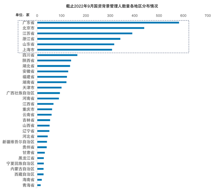 国资背景管理人地区间数量差异较大,数量最多的三个地区总数分别为583家、440家、391家,数量最少的三个地区总数分别为15家、20家、27家。