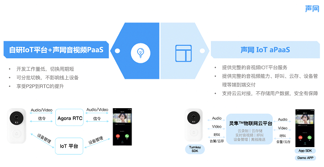 比如,以前厂商需要开发搭载适配硬件的 IoT 平台,需要集成各个组件、移植SDK、优化CPU内存等,而选择声网后,只需要移植整个Turnkey 方案,就能快速完成产品应用的开发和落地,大大降低了研发成本和缩减了上线周期。