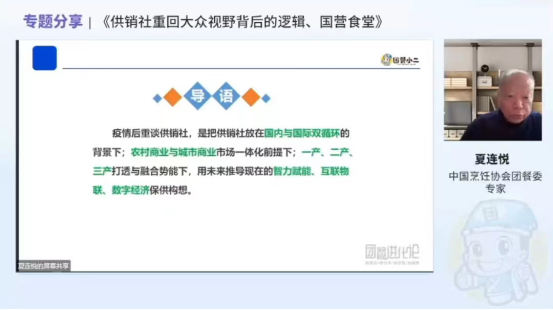 中国餐饮文化大师、中国团餐业态行业专家、中国快餐业态行业专家、中国休闲简餐业态主席夏连悦老师,进行了《供销社重回大众视野背后的逻辑、国营食堂》话题分享。供销社和国营大食堂重出江湖,国家对关系民生的伙食安全与稳定再次放到了重点工作之中,这将使团餐行业加快往规范化和规模化发展,中小团餐企业应该抱团发展,一起做大做强。