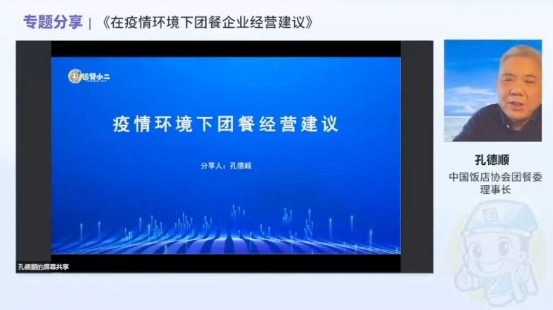 中国饭店协会团餐专业委员会理事长,上海麦金地集团董事长孔德顺先生,分享了《在疫情环境下团餐企业经营建议》,指出在疫情全面放开的大环境下,预估团餐行业将在3月以后迎来高速增长,但市场竞争日益剧烈,而大型的平台型企业将具有发展优势,小型企业只能在平台公司构建的生态体系里寻找细分领域的机会。