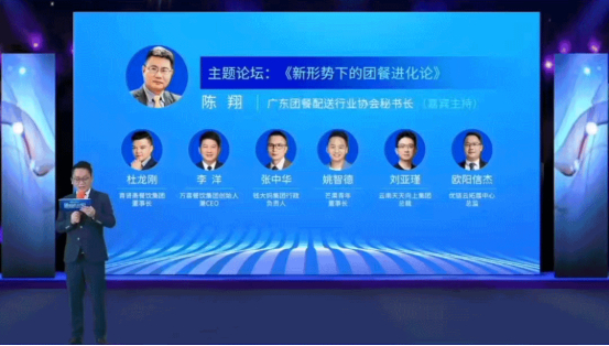 主题论坛:新形势下的团餐进化论,分享嘉宾分别是:万喜餐饮集团创始人兼CEO李洋,芒果青年创始人姚智德,云南天天向上集团总裁刘亚瑾,广东优链云拓展中心总监欧阳信杰,钱大妈集团行政负责人张中华、育贤斋餐饮管理有限公司董事长杜龙刚。同时广东团餐配送行业协会秘书长陈翔担任本次主题论坛主持人。
