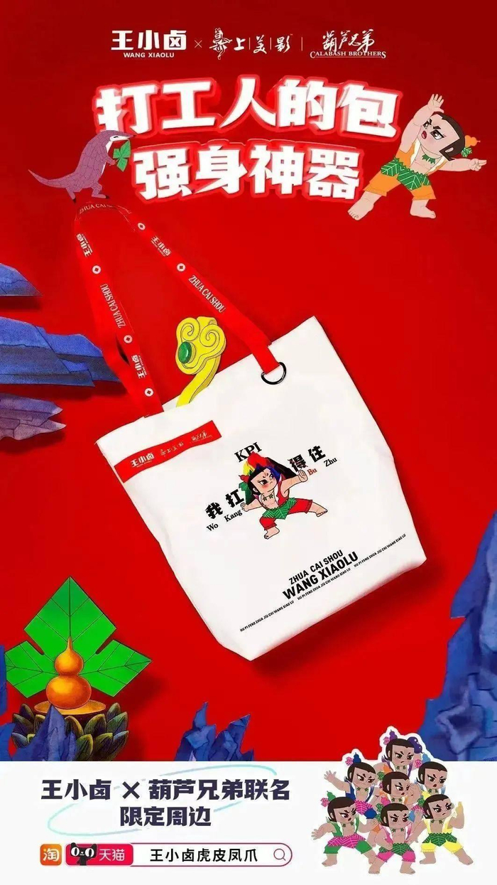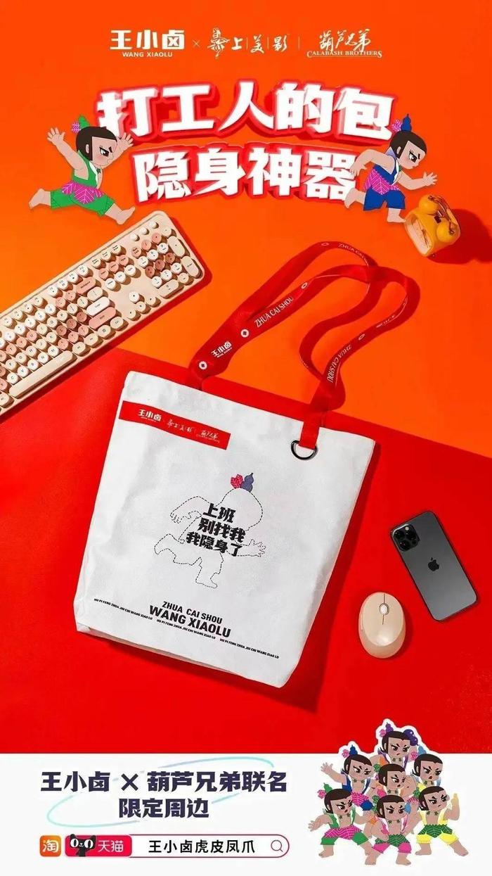 此外,王小卤与葫芦兄弟做了一系列联名周边,比如打工人的帆布包,作为年轻人嘴替喊出“上班,别找我,我隐身了”;比如,洋溢着一股复古摩登气息的葫芦娃联名包装产品。