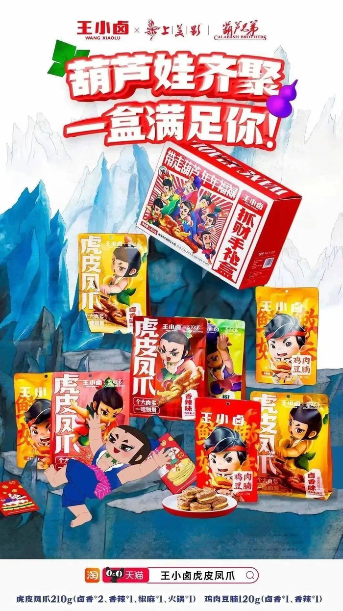 这次的“葫芦娃”联名其实也能看到IP营销的多种可能,葫芦娃、爷爷作为创意广告主角登场;同时,创意广告与福禄抓财手礼盒巧妙捆绑,用“抓财进宝,福禄双全”迎合了消费者群体对春节年货好彩头的渴望和个性追求。