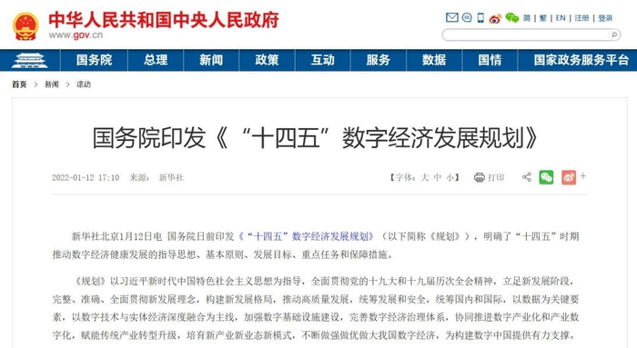 2022年初,国务院印发的《“十四五”数字经济发展规划》(以下简称“《规划》”)中也明确了发展目标:“到2025年,数字经济迈向全面扩展期,数字经济核心产业增加值占GDP比重达到10%,数字化创新引领发展能力大幅提升,智能化水平明显增强,数字技术与实体经济融合取得显著成效,数字经济治理体系更加完善,我国数字经济竞争力和影响力稳步提升。”