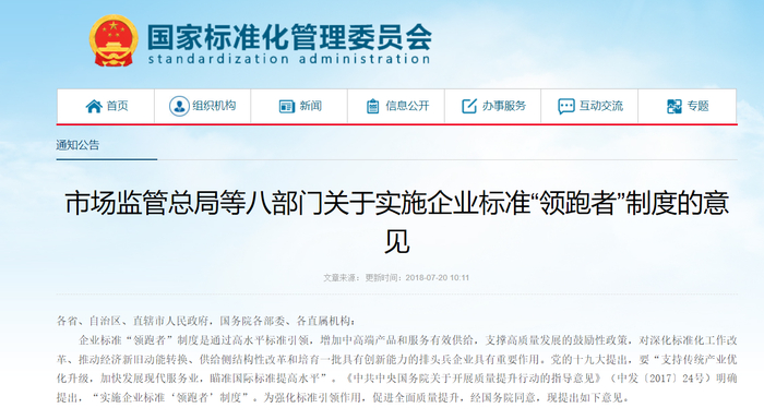 国家政府也高度重视企业标准“领跑者”制度的落实。2018年,国家市场监督管理总局、国家发展和改革委员会、科学技术部、工业和信息化部、财政部、生态环境部、交通运输部、中国人民银行八部门联合印发《关于实施企业标准“领跑者”制度的意见》。